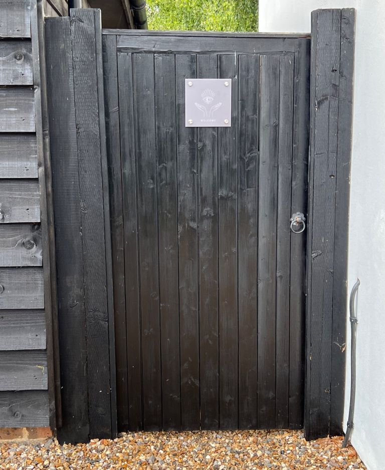 When you pull into the drive, the entrance is to the left of the property, through the solid black wooden gate pictured above (with a grey Welcome sign) that is between the garage and the house front door. The gate is usually open when you arrive. If it is not open it means I am with another client or class and I will open it shortly.